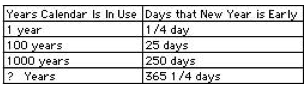 3. The New Years would start on day 1 the first time the calendar was used. But the 365-day calendar ends the year 1/4 day too soon. How many years would it take before a New Year's Day would fall on the right day again? Complete this table to find the answer.