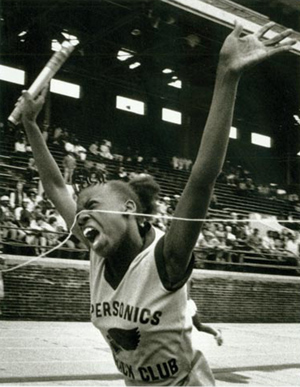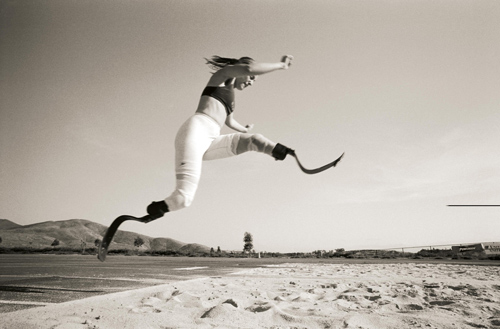 The photo shows a smiling athlete with steel legs being interviewed on a running track. She is Aimee Mullins, a double-amputee and Paralympic record-holder.