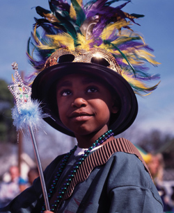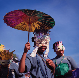 Students bound out of the front doors at NOW, wearing bright feathers, glittery masks and beads. Some dance to the beat of Zydeco music streaming from portable boom boxes; others pull elaborate floats atop wagons. One float is a paper-covered tree, with student photos dangling from each branch. Its sign reads, "We're proud of our roots."