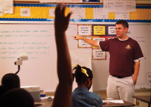 Students in Shaffer's class are active participants in his high-energy lessons, their eyes following him as he moves about the room, desk to desk, making sure everyone stays on task. A favorite among Shaffer's students is the daily "Sensei Karate Grammar" lesson, where students stand and demonstrate a sentence's punctuation marks with karate-like chops, stomps and the occasional "Hi-ya!"