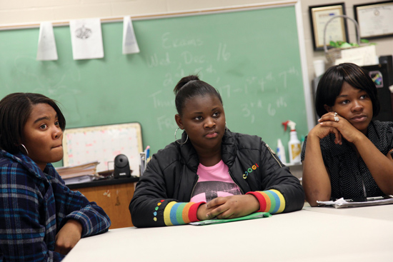 Malone arranges the classroom so everyone is on equal terms. She’s abandoned desks for a table where she joins the students.
