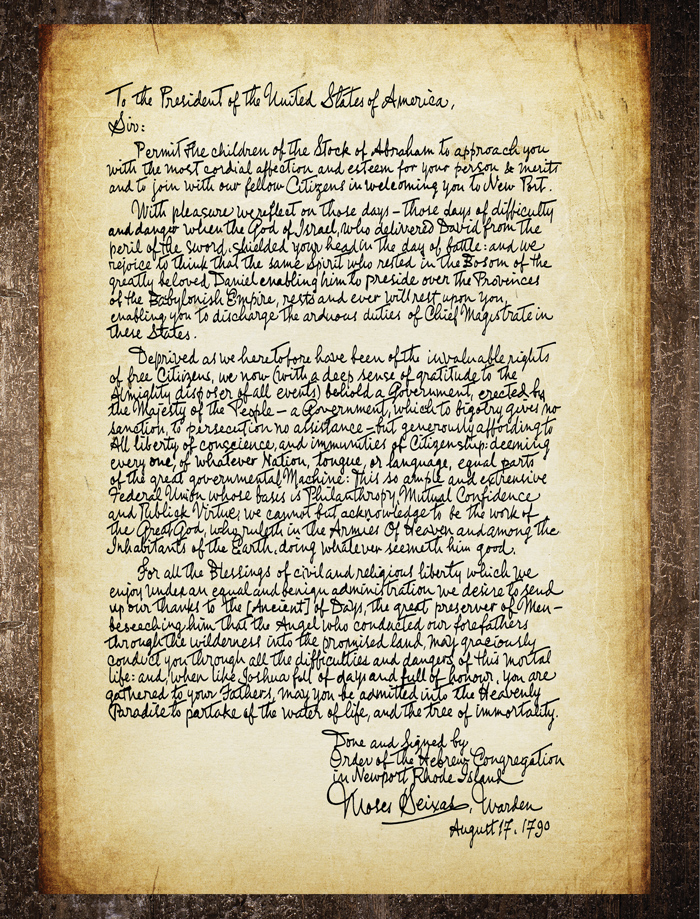 Permit the children of the Stock of Abraham to approach you with the most cordial affection and esteem for your person & merits and to join with our fellow Citizens in welcoming you to New Port.