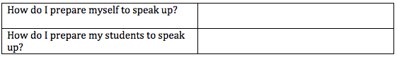 Think/Pair/Share. Think: how will you and your students prepare to speak up? Pair: turn to the person next to you. Share: fill in the chart.